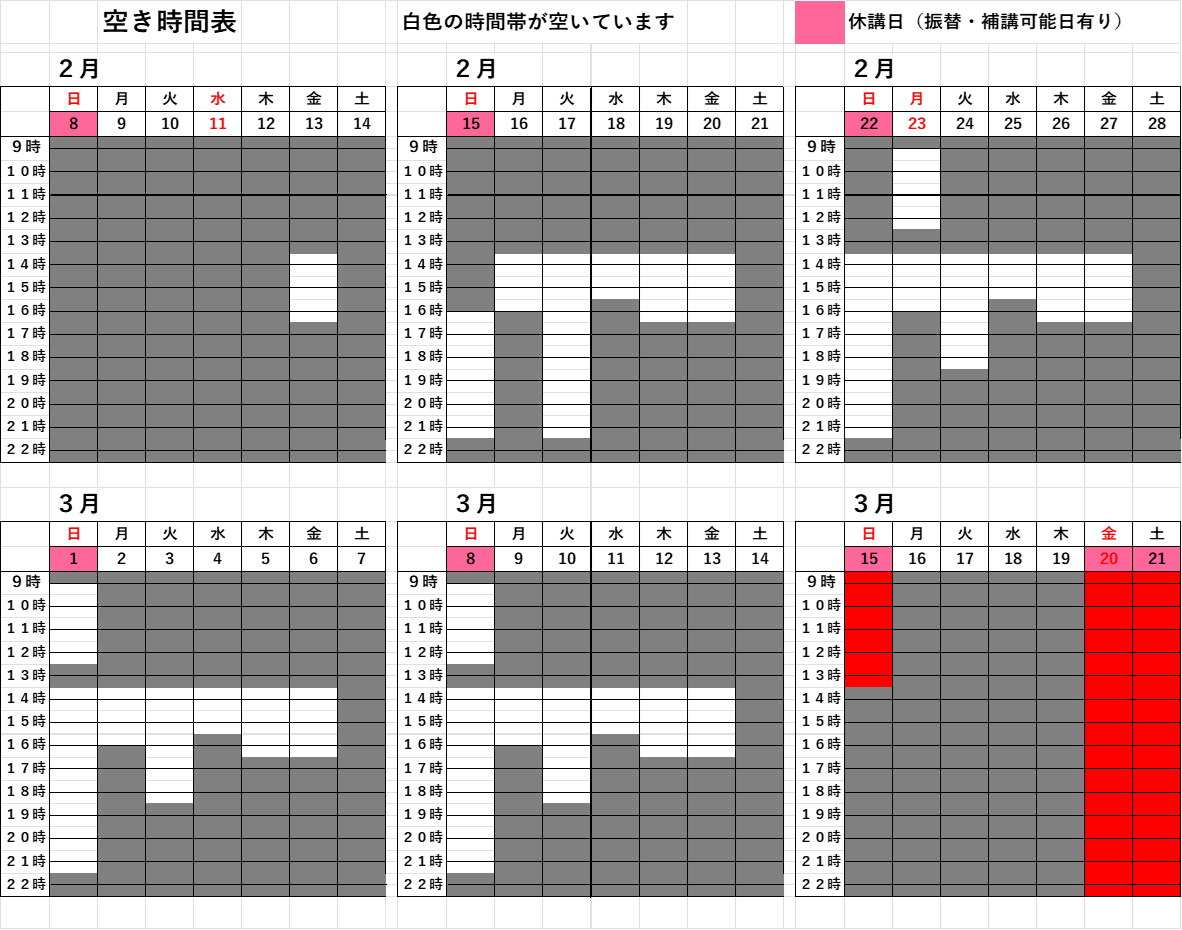 振替・補講の時間指定について ★なるべく2日前までに予約してください。・午前中(土日を含むすべての日)を指定する場合 1時間の振替・補講は、9時~10時または11時15分~12時15分とします。 2時間の振替・補講は、9時~11時または10時15分~12時15分とします。・午後(土日を含むすべての日)を指定する場合 13時30分~21時30分まで、空いている時間内でご自由な時間を指定してください。