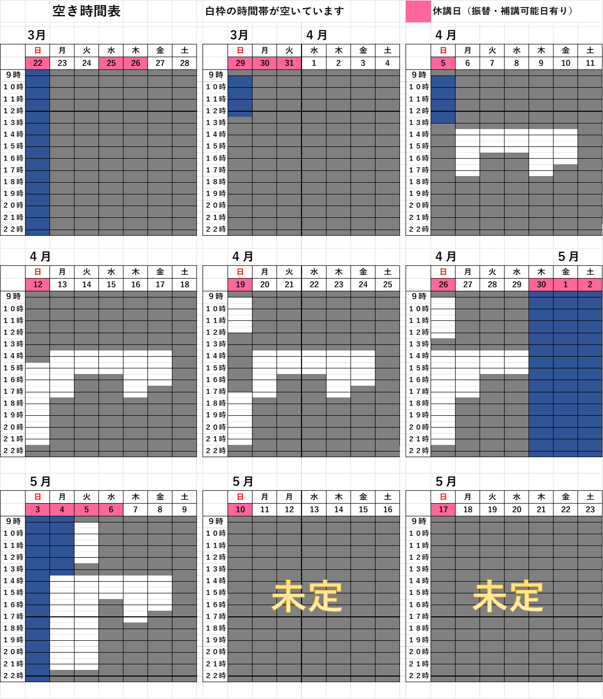 振替・補講の時間指定について ★なるべく2日前までに予約してください。・午前中(土日を含むすべての日)を指定する場合 1時間の振替・補講は、9時~10時または11時15分~12時15分とします。 2時間の振替・補講は、9時~11時または10時15分~12時15分とします。・午後(土日を含むすべての日)を指定する場合 13時30分~21時30分まで、空いている時間内でご自由な時間を指定してください。